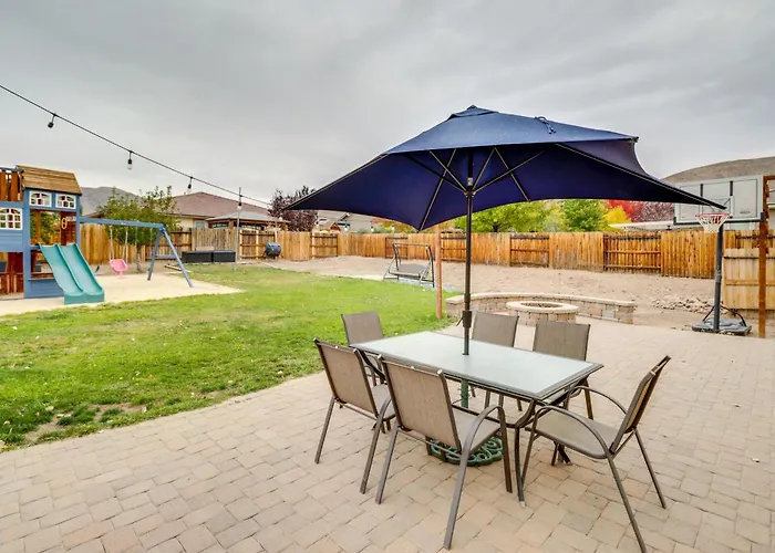 Situé à environ 10 minutes en voiture de la Tamarack Junction, Villa Family-Friendly Retreat With Playground In Reno! à Steamboat invite les clients à se détendre sur une terrasse.
